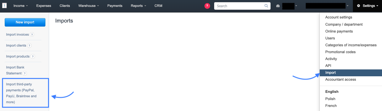 InvoiceOcean allows you to import data based on specific files. In addition to importing invoices, clients or products, you can also import payments. There is the option to import payments based on bank statements, as well as payments from other providers. In this article, you will learn how to import payments from providers such as PayU, PayPal, or Braintree.