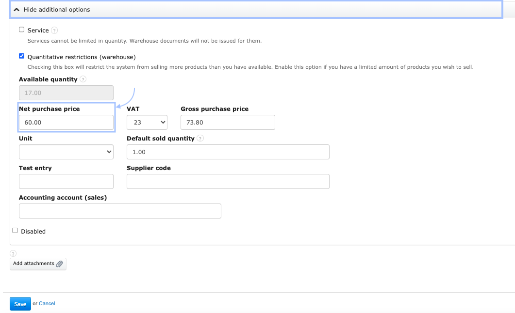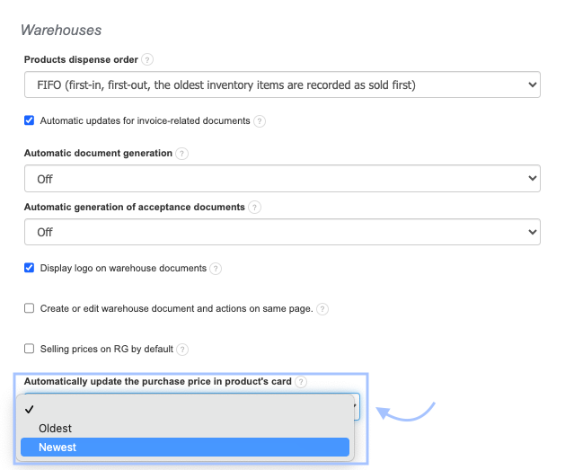 This option is available by going to the Settings > Account Settings > Configuration > Warehouses. In the Automatically update the purchase price in product's card field, you can choose one of three options: an empty field, the oldest, the newest. You can find a detailed description of this feature in the dedicated entry → Automatic update of purchase prices on the product card.
