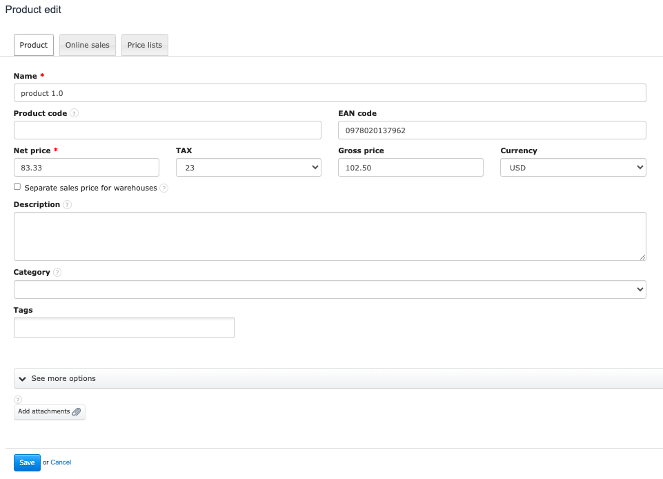 5. To create a product or confirm changes made in the product card, use the Save button.