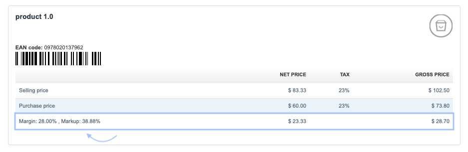 Based on the entered selling price and purchase price, the system will display the margin and markup in the product card.