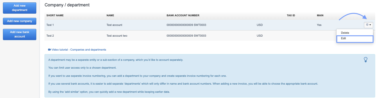 To set the logo within the Company/department settings, go to Settings > Company/department. With the selected department/company, click on the gear icon on the right and choose Edit