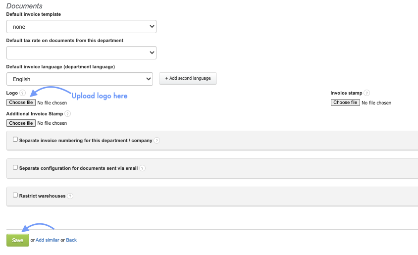 IMPORTANT! When you remove the old logo and upload a new one, the new logo will appear on all new documents as well as those issued earlier. In this situation, if your company is refreshing, changing its logo, we recommend creating a new department to maintain proper archiving of previously issued documents.