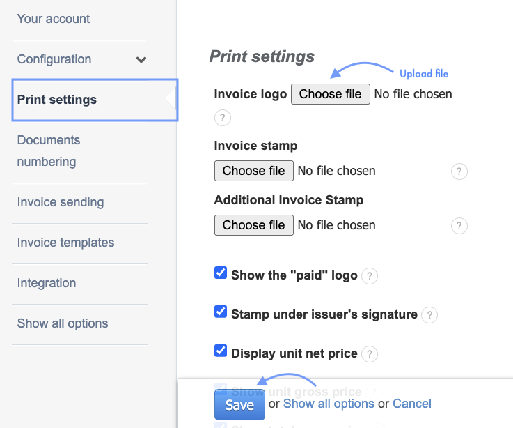The second method of adding a logo. Go to Settings > Account Settings > Print settings. In the line labeled Invoice logo, press the button Choose file. After making your selection, press the Open button. The logo has been added. To have the logo appear on the invoice, press the Save button. If you want to remove the logo, you can easily do so by clicking below the graphic in the box next to the Delete logo label.
