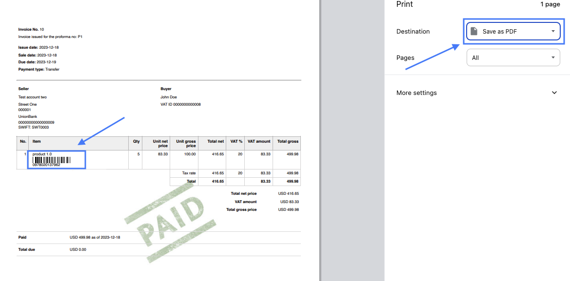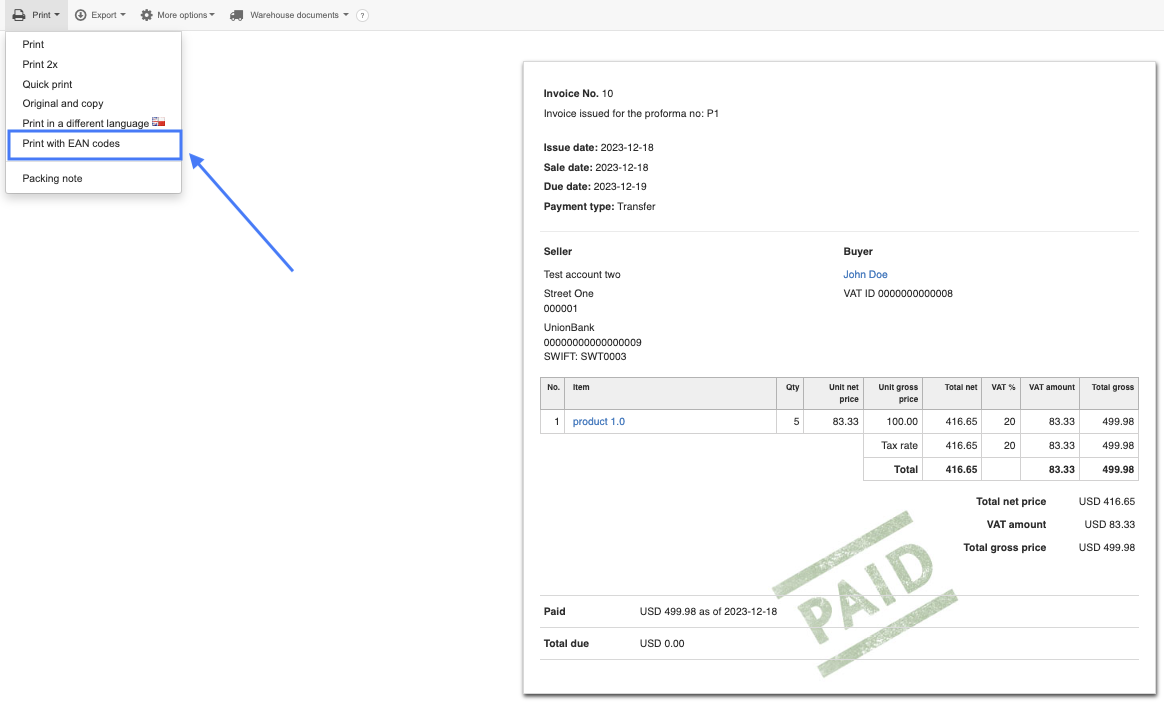 - Displaying barcodes on invoices. To do this, while in the invoice preview, select the option: Print > Print with EAN codes; a printer settings window will open, allowing you to start printing.