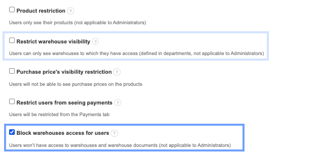 If you want to allow a user access only to the warehouses assigned to them, use the option highlighted with a light frame in the above graphic. You can find a full description of the function here