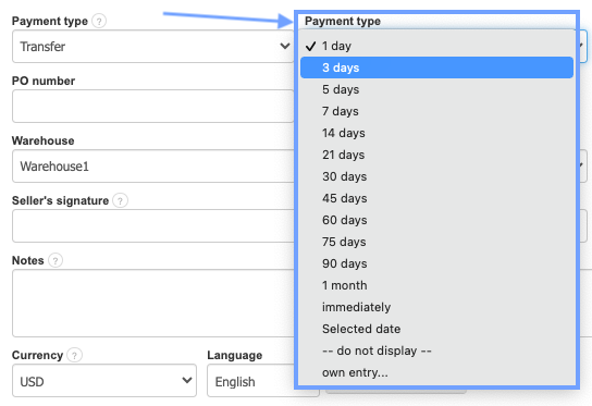 When issuing an invoice, you can specify the deadline by which you expect payment for the transaction from your contractor. To do this, in the Payment type (term) field, located on the invoice form below the document item table, enter the preferred value using the options suggested by the system or enter your own (use the Own entry option, then enter only the numerical value without the "days" label). If you choose the option 'Do not display,' then your invoice will not have a specified payment deadline. The deadline you set as the payment term will impact the payment status shown by the system (see the article about invoice statuses). If the document is not marked as paid before the specified payment term expires, the status will automatically change to Payment delayed (red color indicating the status), and the system will indicate the period that has passed since the payment term. With this information, you can set a reminder for unpaid invoices