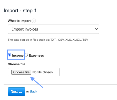 To import invoices to the program from an xls file, go to Settings> Import> Import invoices, check the Income box and click Choose file.