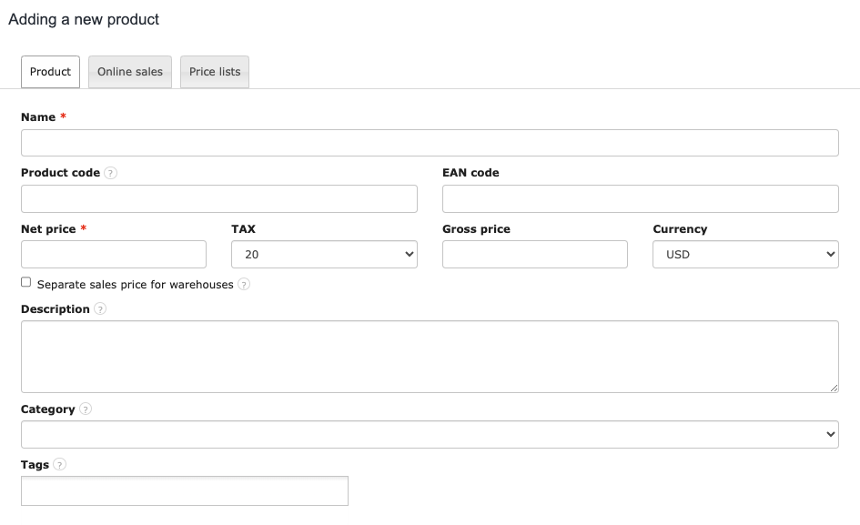 Product code - in this field, you can enter the manufacturer's code | you can read more about the product code in the article → Product Codes;