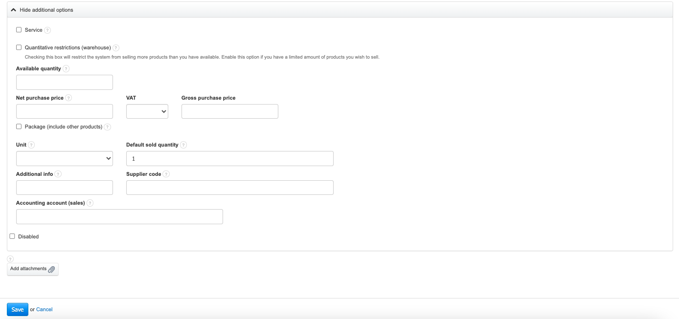 - Add Attachments button - allows you to add, for example, product photos | more about attachments in the product card in the article → Add attachments in the product card.