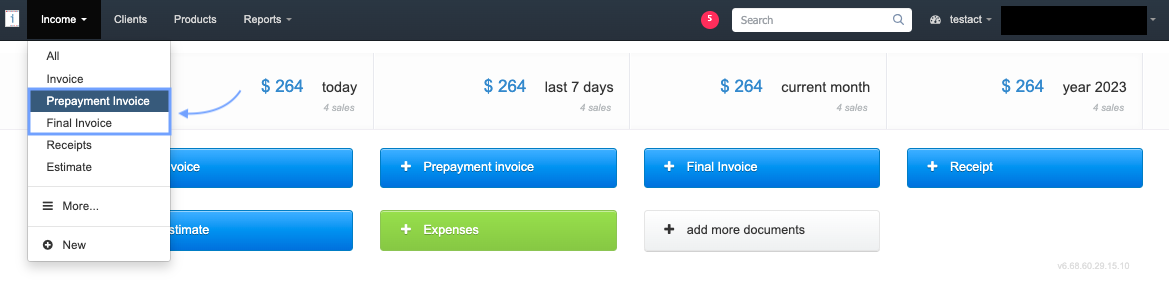 Important: If you are using InvoiceOcean reports and files like JPK_V7, before issuing a prepayment invoice, create an Estimate. From the Estimate view, in the top menu, select More options > Create prepayment invoice. A window will appear where you need to enter the amount of the received prepayment. The system will automatically fill in the document template. You can create one or multiple Prepayment Invoices for one Estimate To issue a Final Invoice, from the view of the last Prepayment Invoice, choose from the context menu More options > Issue final invoice. The system will automatically calculate the value of the final invoice, subtracting the prepayments received from the total Estimate.