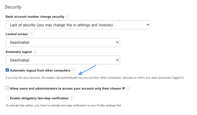 In order to enable this feature, go to Settings > Account settings > Configuration > Security > Automatic logout from other computers.
