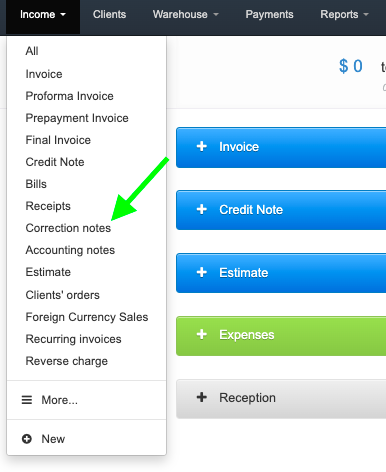 After saving the entered changes, you can easily generate a correction note. Simply go to the preview of the cost invoice. In the invoice preview you have a pop-up menu placed above and under the invoice. From the pop-up menu, select the More options tab and then Issue correction note.
