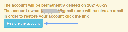 If you choose the first option and click the link in the email, the system will display a message with a Restore Account button. The time to use the account restoration option is 7 days. During this period, you can go back to the sent email and use the link to restore your account in the system.
