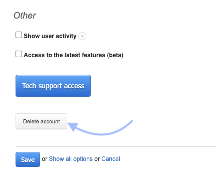 - Press the gray Delete Account button (remember that only the user with the account owner status can see it).