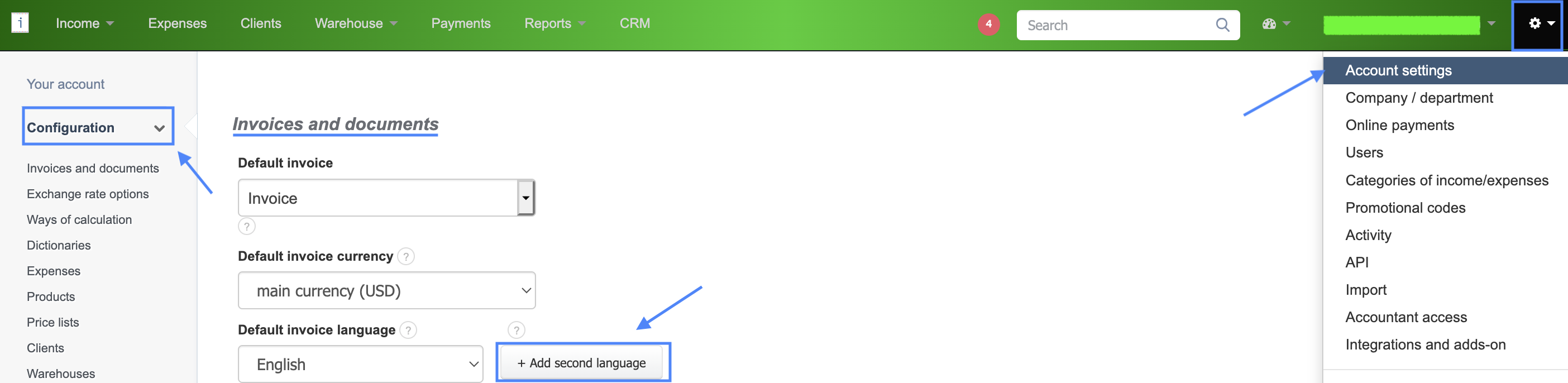 - in the section Invoices and documents, click on the button Add second language,