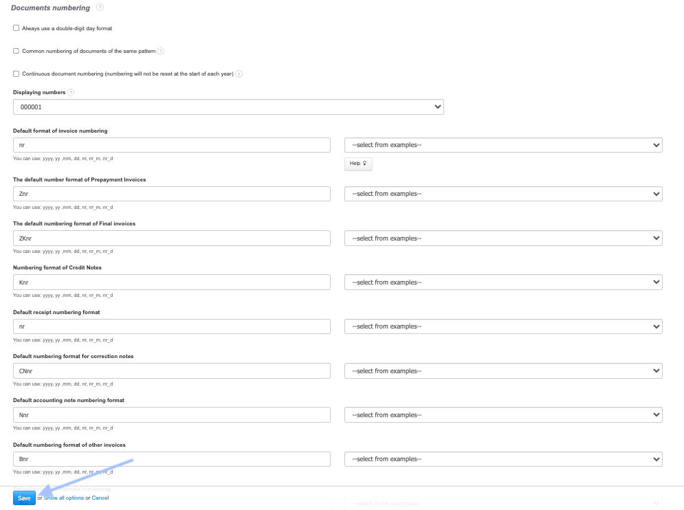 For each document, you can choose a sample format. If none of them suits you or if you are starting to use InvoiceOcean during an ongoing annual settlement cycle and want to maintain continuity in numbering, set up your current way of describing documents using the following variable parameters for dates and numbering: yyyy, yy, mm, dd, nr, nr-m, nr-d. Then confirm the changes by clicking Save.