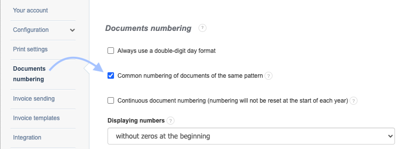 - From the menu on the left, select Documents numbering - here you will see the current default numbering format for various types of documents.