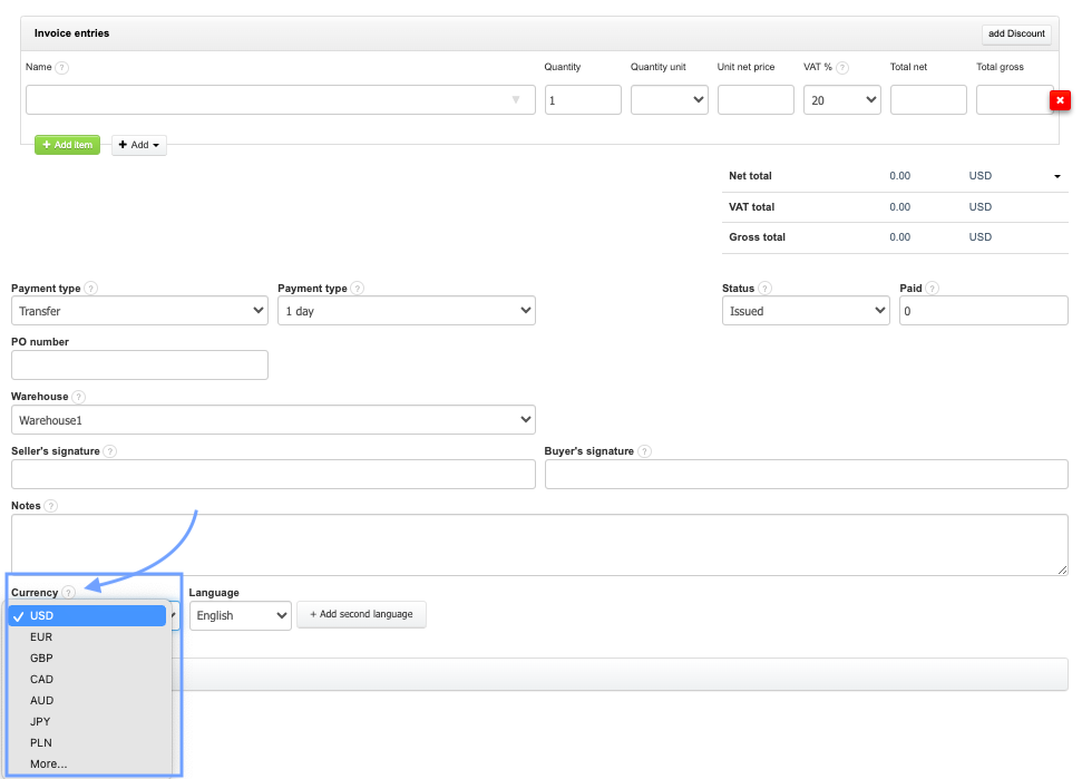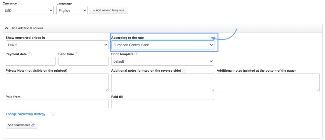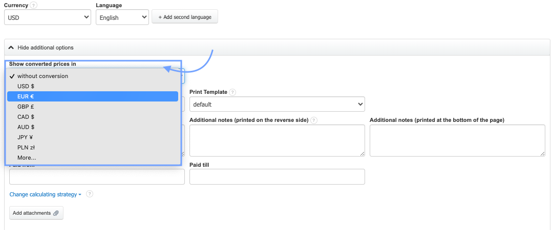 This conversion will appear as soon as you save the document. However, please note that only one of the templates available in InvoiceOcean - gray template - will additionally show the amount paid in two currencies and the amount in words on the generated invoice.